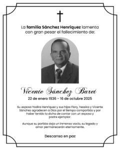 Su esposa Yadira Henríquez y sus hijos Flory, Yéssika y Vicente agradecen a Dios por el tiempo compartido y por haber tenido la dicha de contar con un esposo y padre ejemplar. «Aunque su partida deja un inmenso vacío, su legado y amor permanecerán eternamente», expresan.