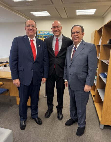 El gobernador del Banco Central de la República Dominicana, Héctor Valdez Albizu, y el ministro de Hacienda y Economía (MHE), Magín Díaz, sostuvieron un encuentro bilateral con André Roncaglia, director ejecutivo del Fondo Monetario Internacional (FMI) por Brasil y presidente de la constituyente de países a la cual pertenece la República Dominicana, en el marco del inicio de las Reuniones Anuales del FMI y del Banco Mundial de 2025. Washington D.C., Estados Unidos.