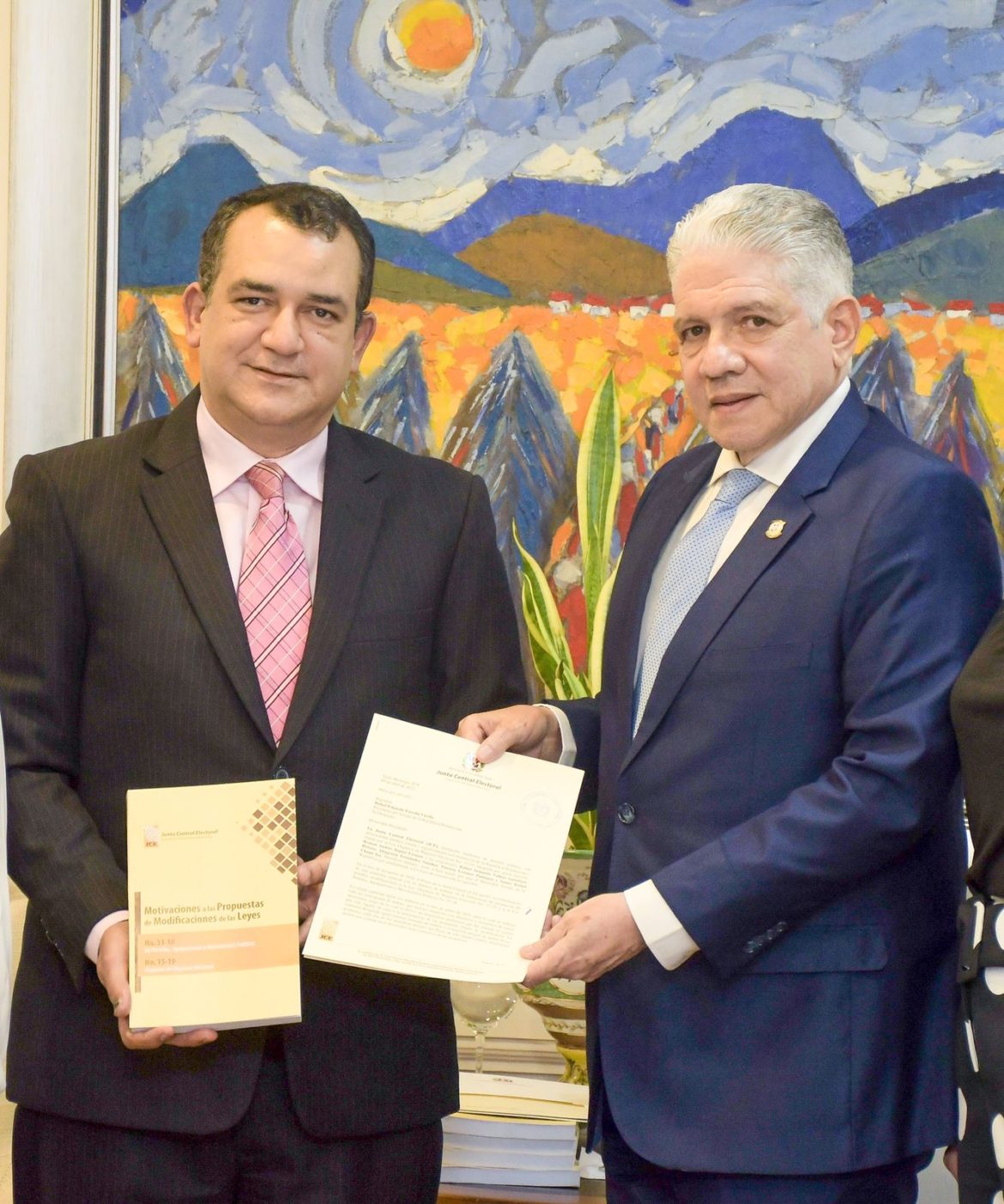 El presidente del Senado de la República, Eduardo Estrella, recibió del pleno de la Junta Central Electoral (JCE) los proyectos de modificación a la Ley 15-19 Orgánica del Régimen Electoral y de la Ley 33-18 de Partidos, Agrupaciones y Movimientos Políticos.