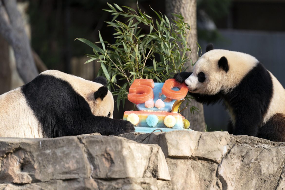 Los dos pandas disfrutaron un desayuno frente al público el pasado sábado, cuando devoraron un pastel helado con motivo de la celebración de los 50 años de un acuerdo entre el zoológico y el gobierno chino para el intercambio de estos animales.